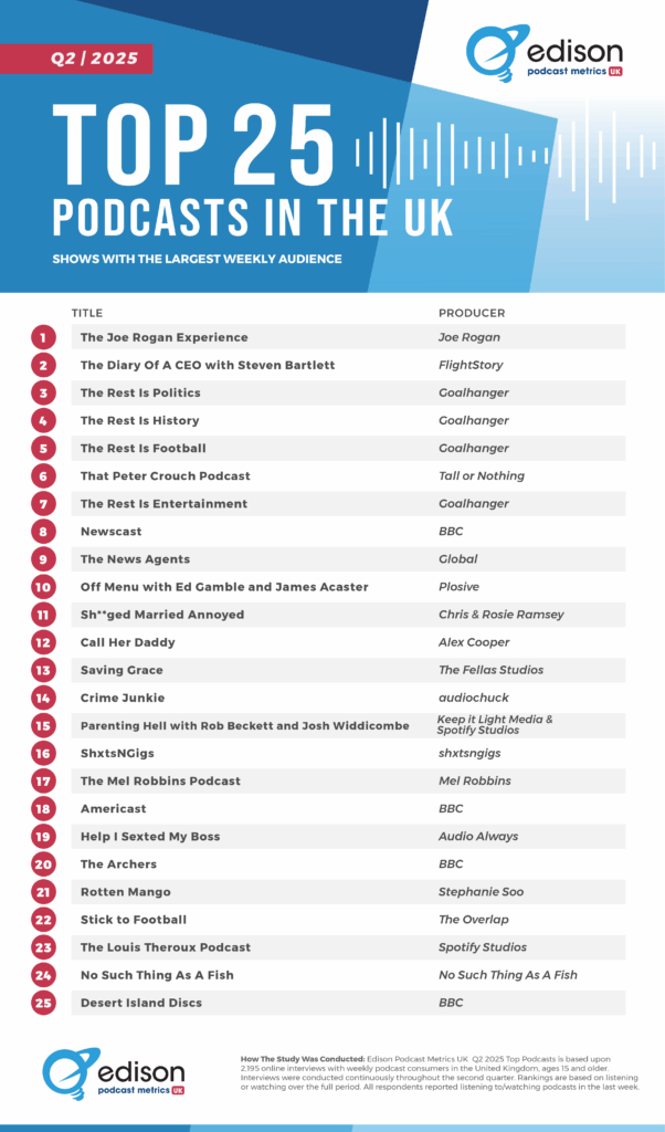 Last week, Edison Research published their latest list of the Top 25 podcasts in the UK for Q2 2025. This is the most visible chart of which podcasts are being listened to, since the charts from providers like Apple and Spotify aren’t true charts for the whole industry, and tend to be tweaked for newness purposes.