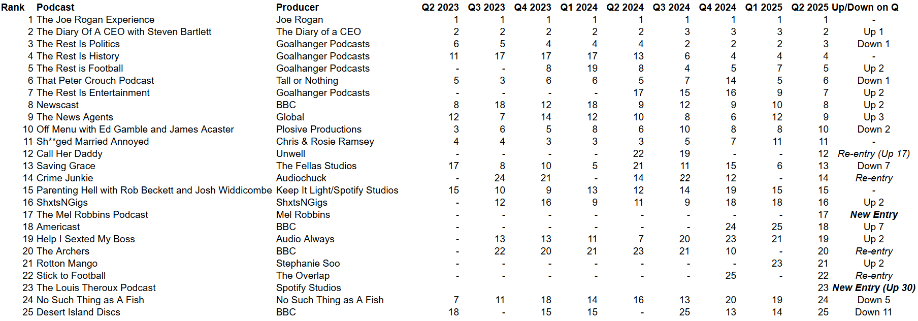 Elsewhere, Crime Junkie comes back into the chart after a quarter out, and The Mel Robbins Podcast is a complete new entry mirroring her success in the US where she is at number 11.
